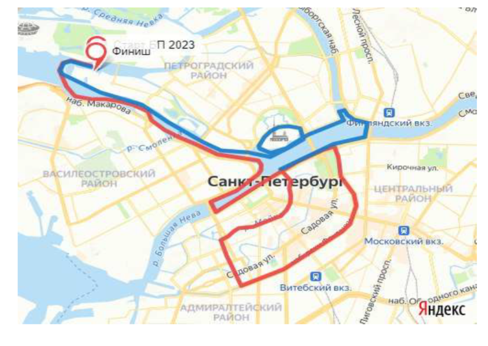 Маршрут движения: Петровская коса – Малая Невка – Малая Нева – мимо стрелки В.О. в Большую Неву, проход вдоль Университетской набережной, разворот у Благовещенского моста, по Большой Неве до Фонтанки – по Фонтанке в Крюков канал – река Мойка – Зимняя канавка – выход в Большую Неву разворот у Литейного моста к Авроре, разворот назад мимо Петропавловской крепости, в Малую Неву к месту (финиша) на Петровской косе. Место сбора Петровская коса (схема участка прилагается).