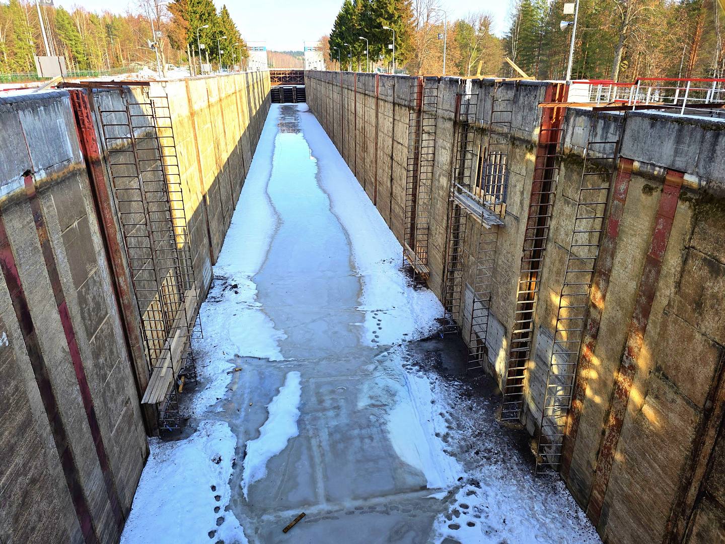 − замена 290 кубических метров дефектного бетона стен камер, устоев голов, водопроводных галерей, направляющих пал, парапетов, а также штрабного бетона закладных частей механического оборудования, очистка днища камеры шлюза № 1 от наносов в объёме 450 т, ремонт деревянных забирок подводных частей шлюза № 2 на площади 50 квадратных метров;