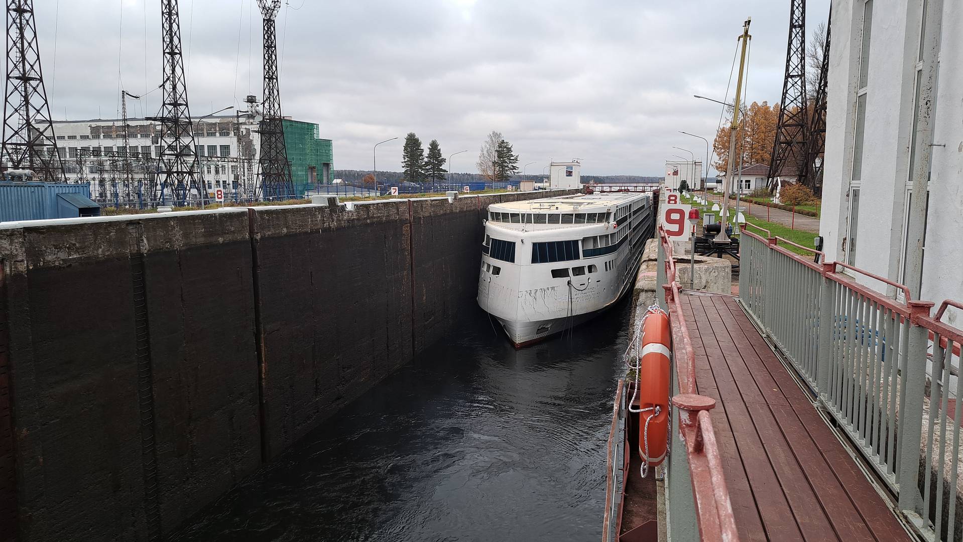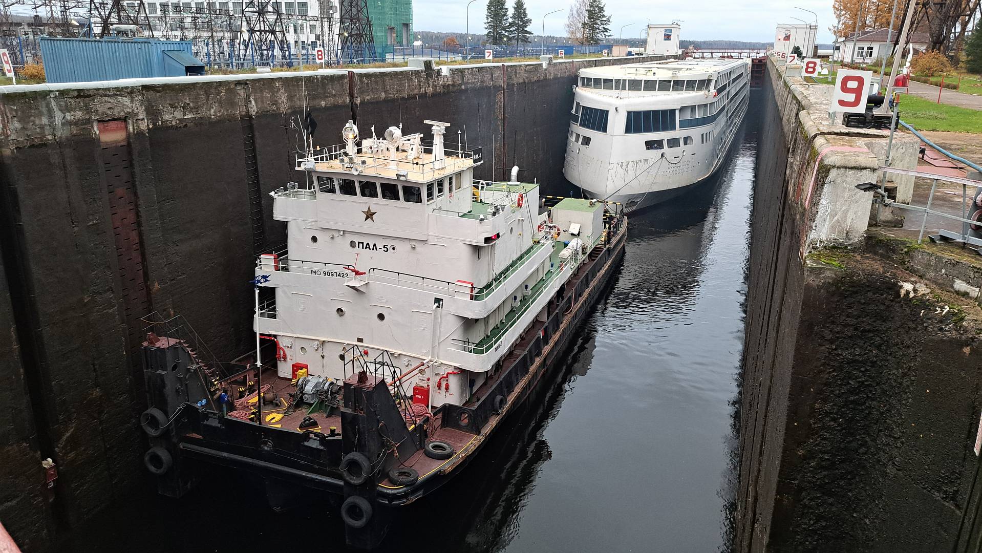 В конце октября на Нижне-Свирском шлюзе ФБУ «Администрация «Волго-Балт» была проведена сложная и нестандартная операция по шлюзованию. Состав, состоящий из головного буксира «ПАЛ-5», буксира-толкача «Коневец» и пассажирского судна проекта PV300VD «Владимир Жириновский», направляющегося на достройку в Санкт-Петербург, успешно преодолел шлюз. Уникальность ситуации заключалась в значительной длине состава – 236,18 метра, что существенно превышает полезную длину камеры шлюза (196,8 м). Для обеспечения безопасного и эффективного прохождения шлюза был разработан и реализован двухэтапный план.
