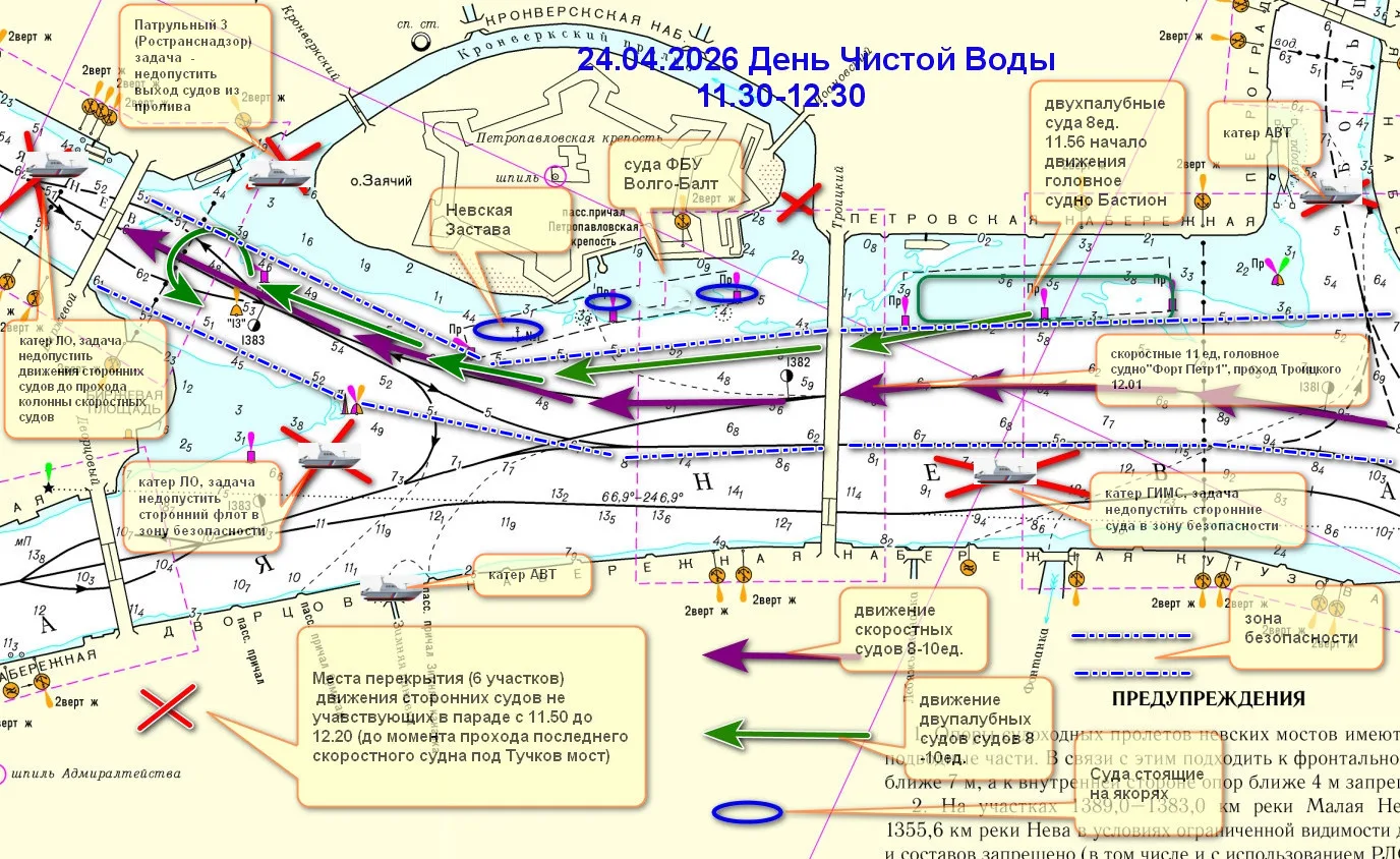 В рамках ежегодного мероприятия День Чистой Воды, посвященному открытию регулярного судоходства на реке Неве, 24 апреля с 11:50 до 12:30 на участке реки Невы от Литейного моста до Тучкова моста состоится проход колонны пассажирских судов, в том числе скоростных. Суда, не участвующие в мероприятии должны соблюдать осторожность и не препятствовать прохождению колонны. На этот период разрешен проход судов вниз по течению между опорами 5-6 Троицкого моста, высотный габарита пролета 6,3 м от проектного уровня, гарантированная глубина 4,0 м, ширина 20,0 м.