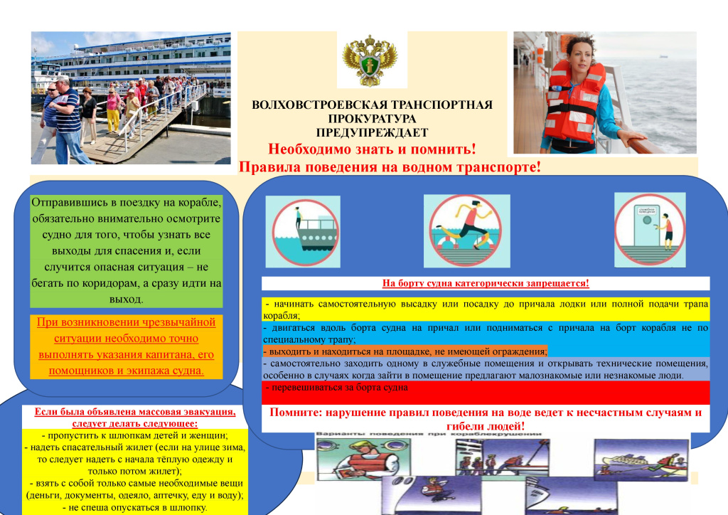 Волховстроевская транспортная прокуратура напоминает о необходимости соблюдения правил поведения на водном транспорте.